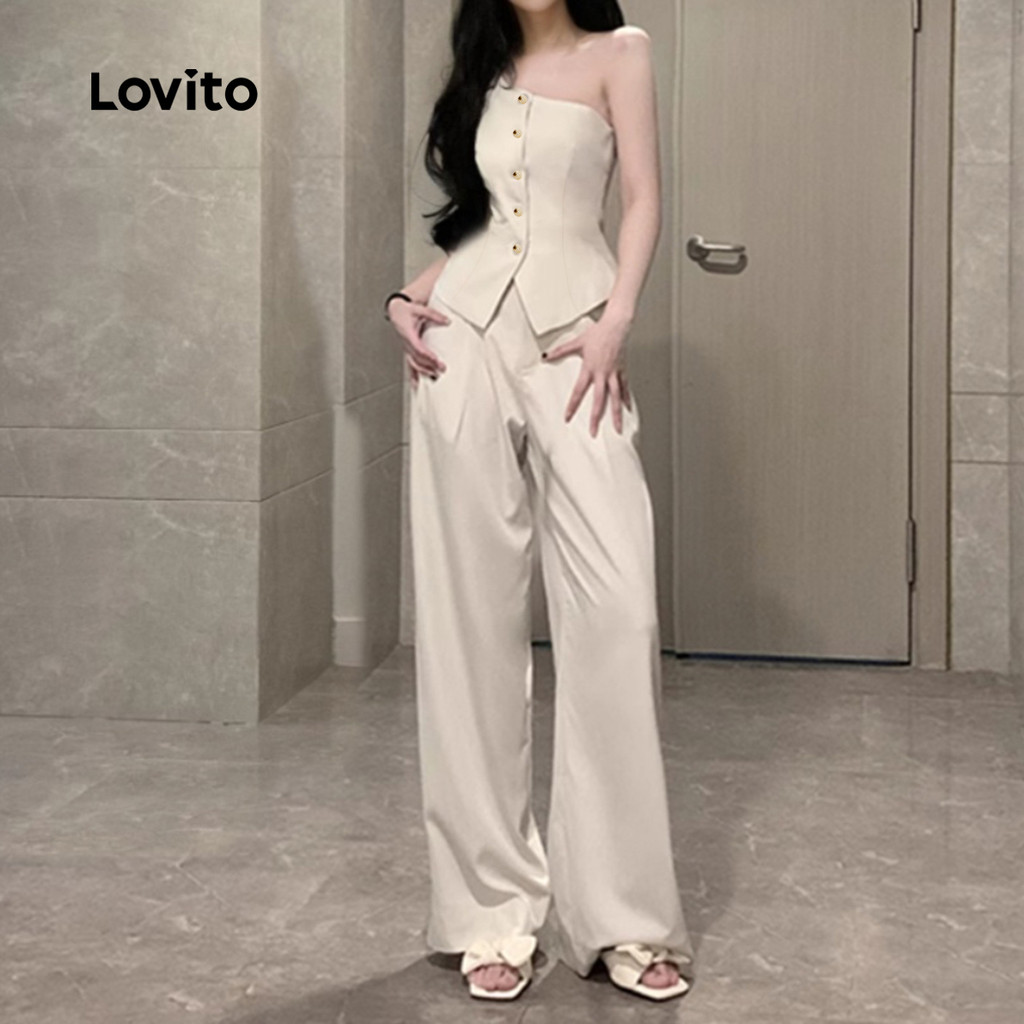 Lovito Conjuntos de Calças Casuais com Zíper e Pregas Calças de Primavera/verão em Damasco para Mulheres L138ED185