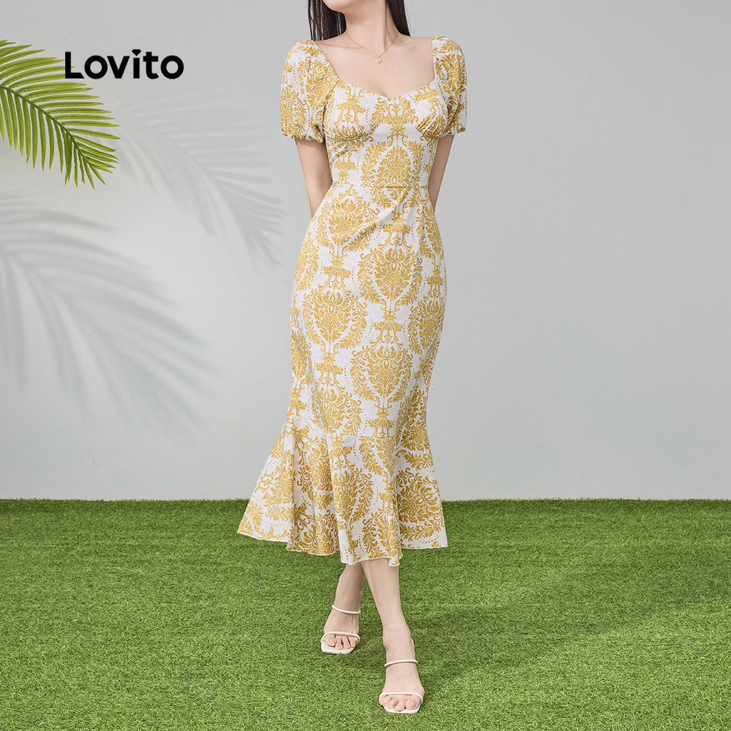 Lovito Elegante Vestido Amarelo Com Estampa Tribal E Bainha Com Babados E Linha Primavera/Verão Para Mulheres L134LD210