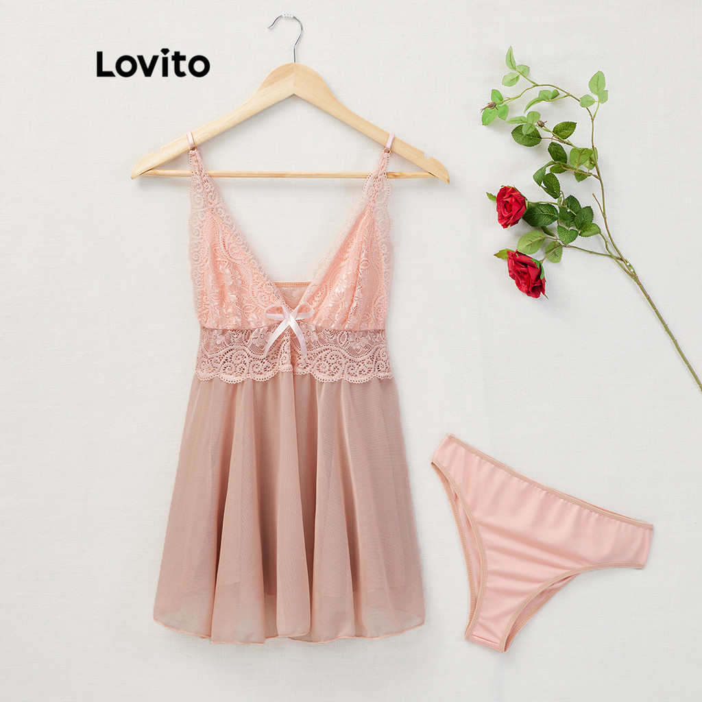 Lovito Lingerie Sexy de Renda Cintura Alta Decote V Profundo L17X059 (Rosa/Vermelho)