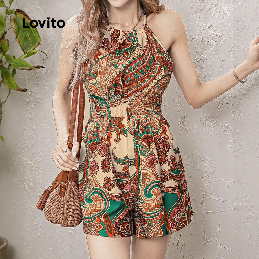 Lovito Macacão Boho Smocked para Mulheres Primavera/Verão L172ED1126