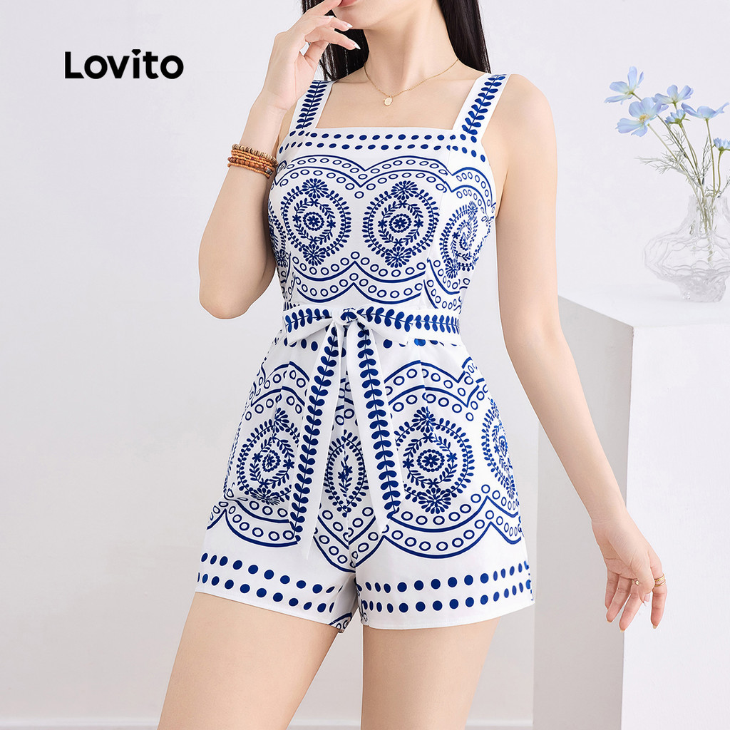 Lovito Macacão Boho Tribal Print Tie Front para mulheres L132ED206