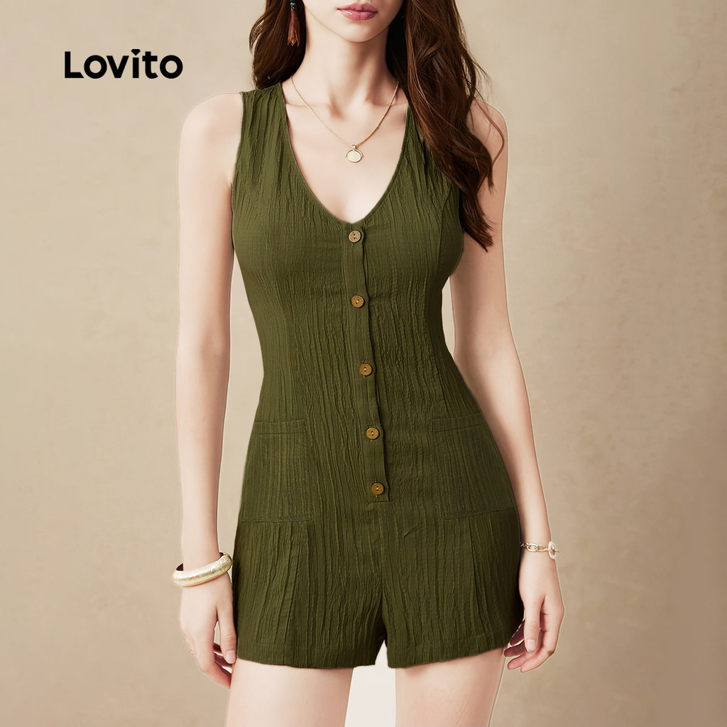 Lovito Macacão Casual com Botões Bolso Primavera/verão Macacão Verde Militar para mulheres L138AD884