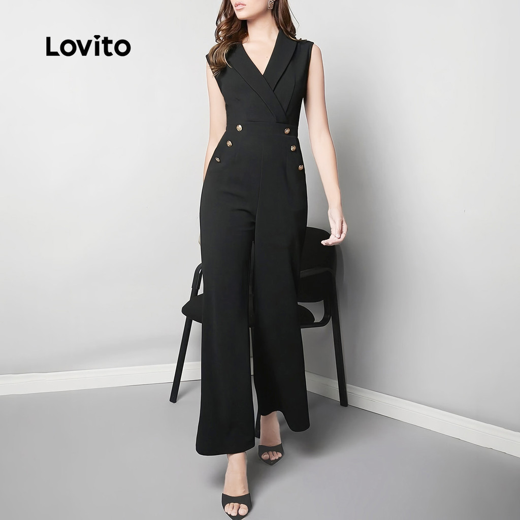 Lovito Macacão Casual de Botões com Pregas Primavera/verão Preto para mulheres L143AD661