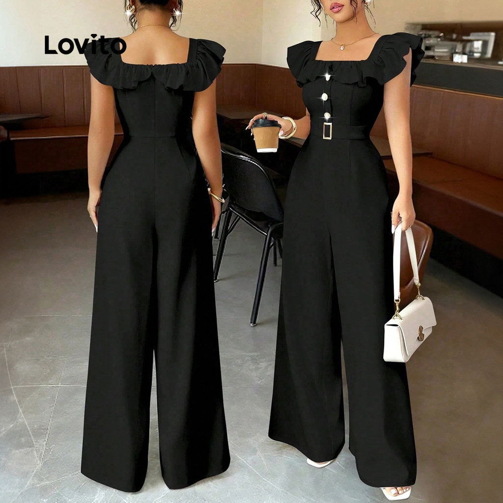 Lovito Macacão elegante com babados e cinto primavera/verão macacão preto para mulheres LK3LD363