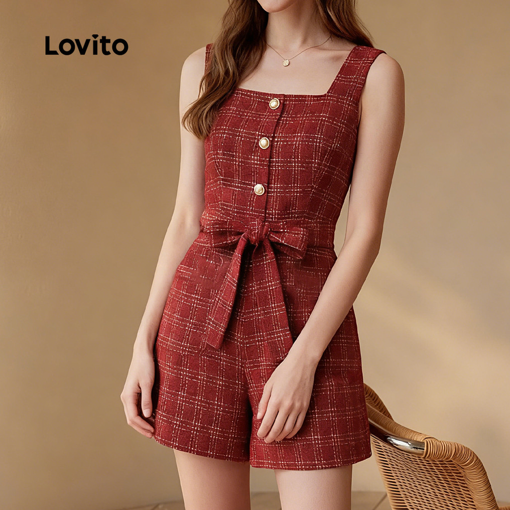 Lovito Macacão Elegante De Festa Com Botões Frontais Vermelho Para Mulheres Ideal Para Primavera/verão L164ED390