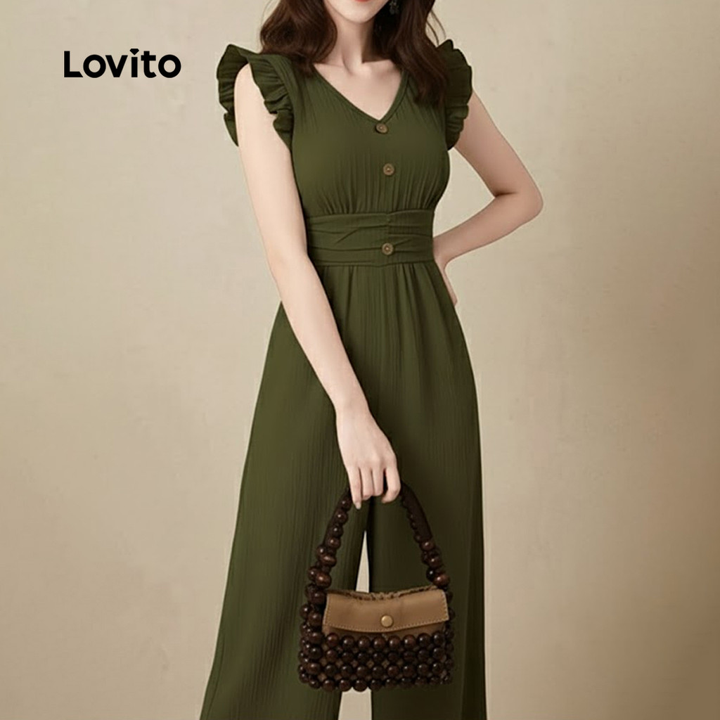 Lovito Macacão Feminino Casual em Jacquard com Babado para Primavera/Verão na cor Verde LK2ED079