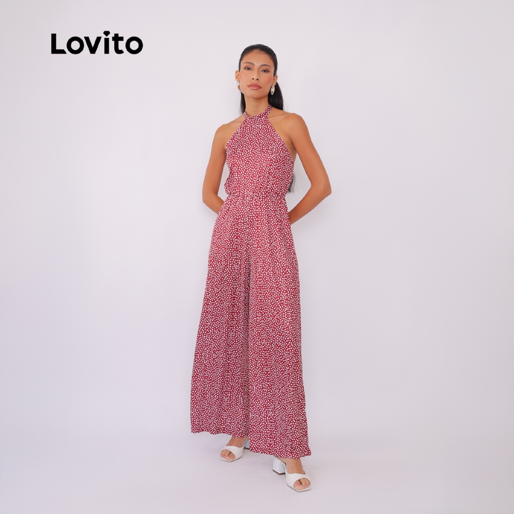 Lovito Macacão Longo Sem Mangas Alfaiataria Acinturado Moda Elegante Poá para Mulheres JRB873BRL903