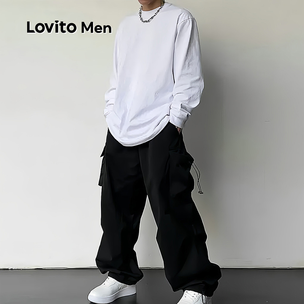Lovito Men Estrutura de Bolso de Carga Casual com Linha de Amarração para Todas As Estações em Preto Cargo LNE118052