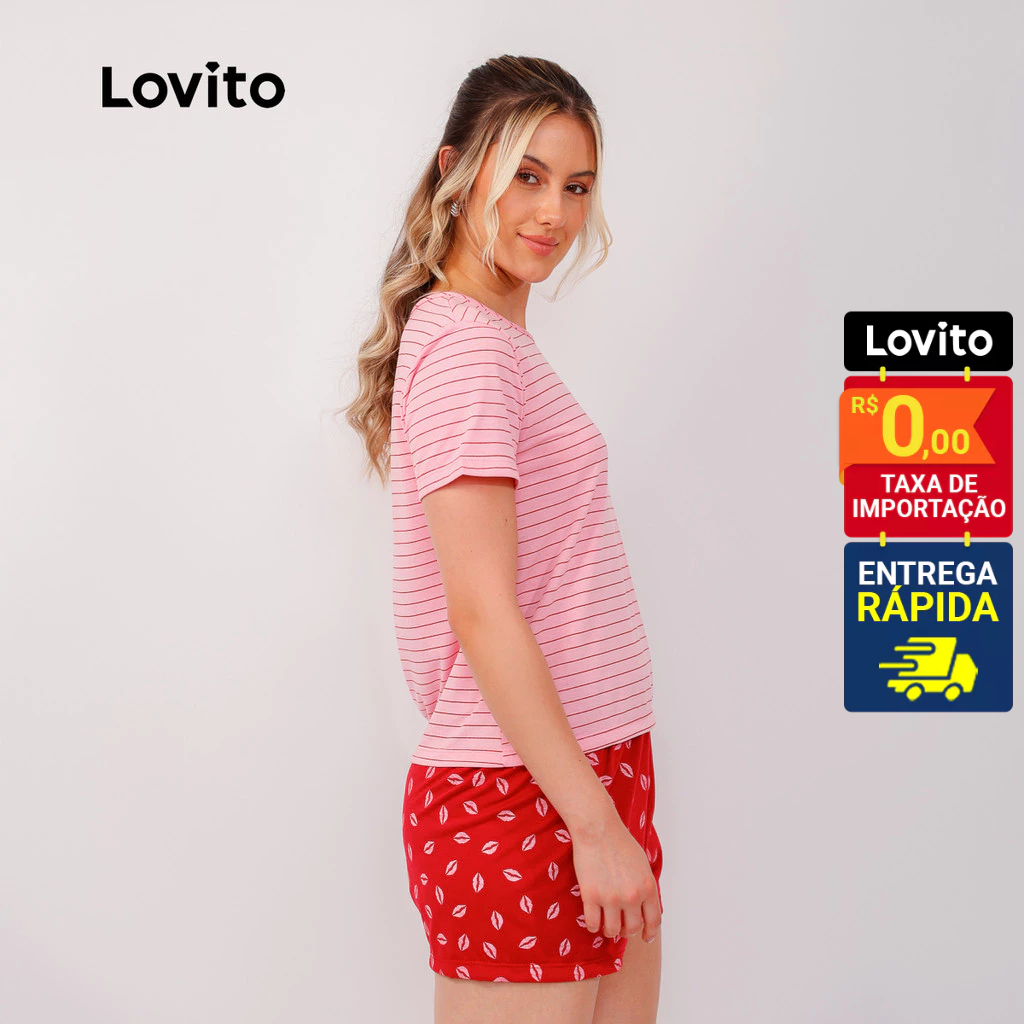 Lovito Pijama T-shirt e Shorts Curto Casual Listrado Feminino LB1252BRL1282
