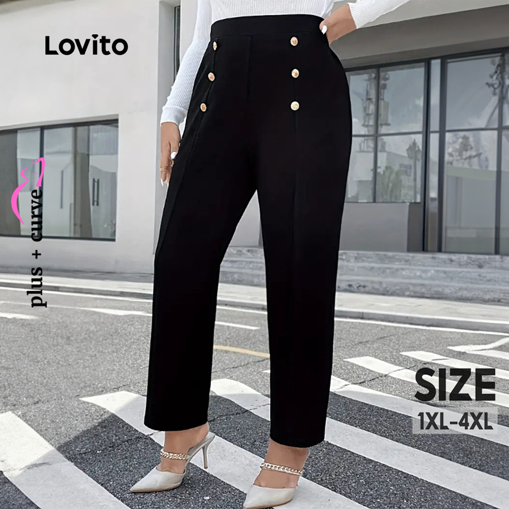 Lovito Plus Size Curva Elegante Botão Simples Todas As Estações Calças Azul Escuro Para Mulheres LNE103028
