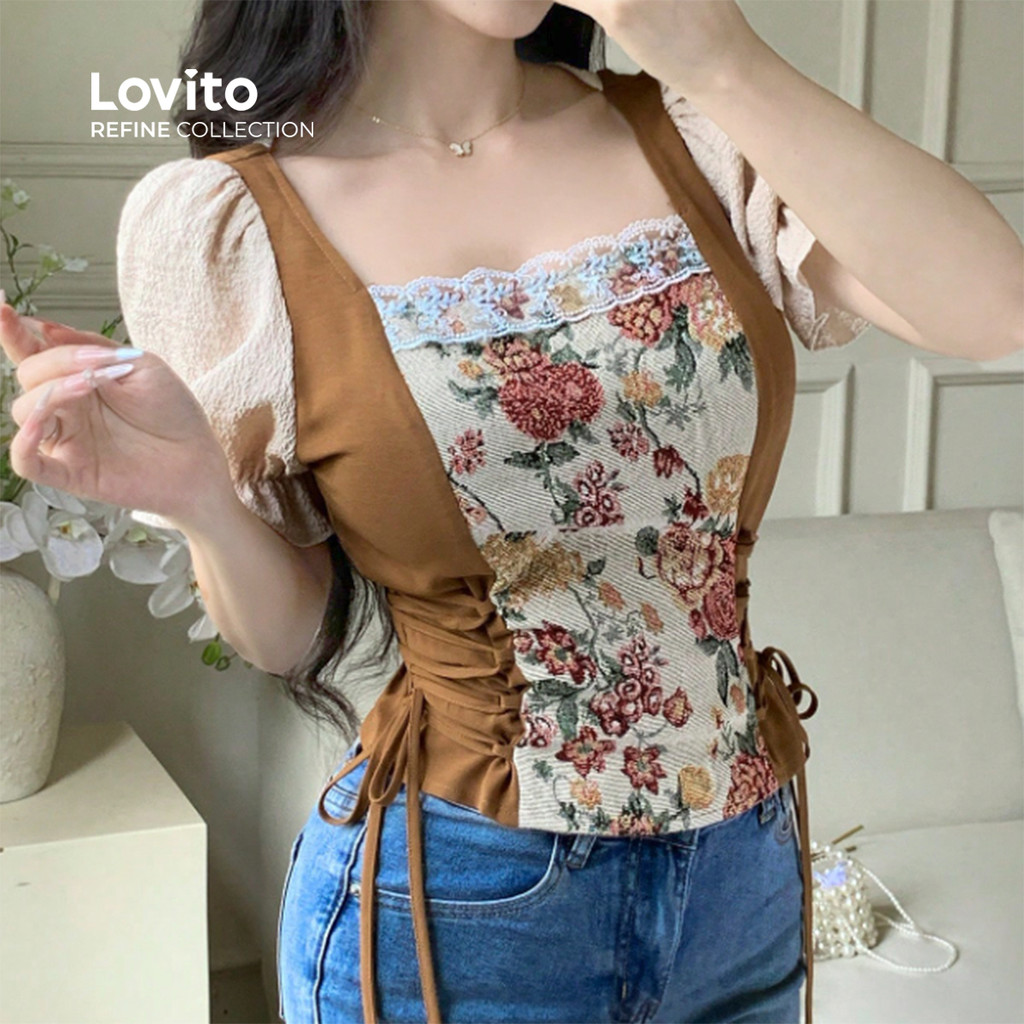 (Lovito Refine) Blusa Boho em Tecido Costura Blocagem de Cores Blusa de Primavera/verão para mulheres LR23E002