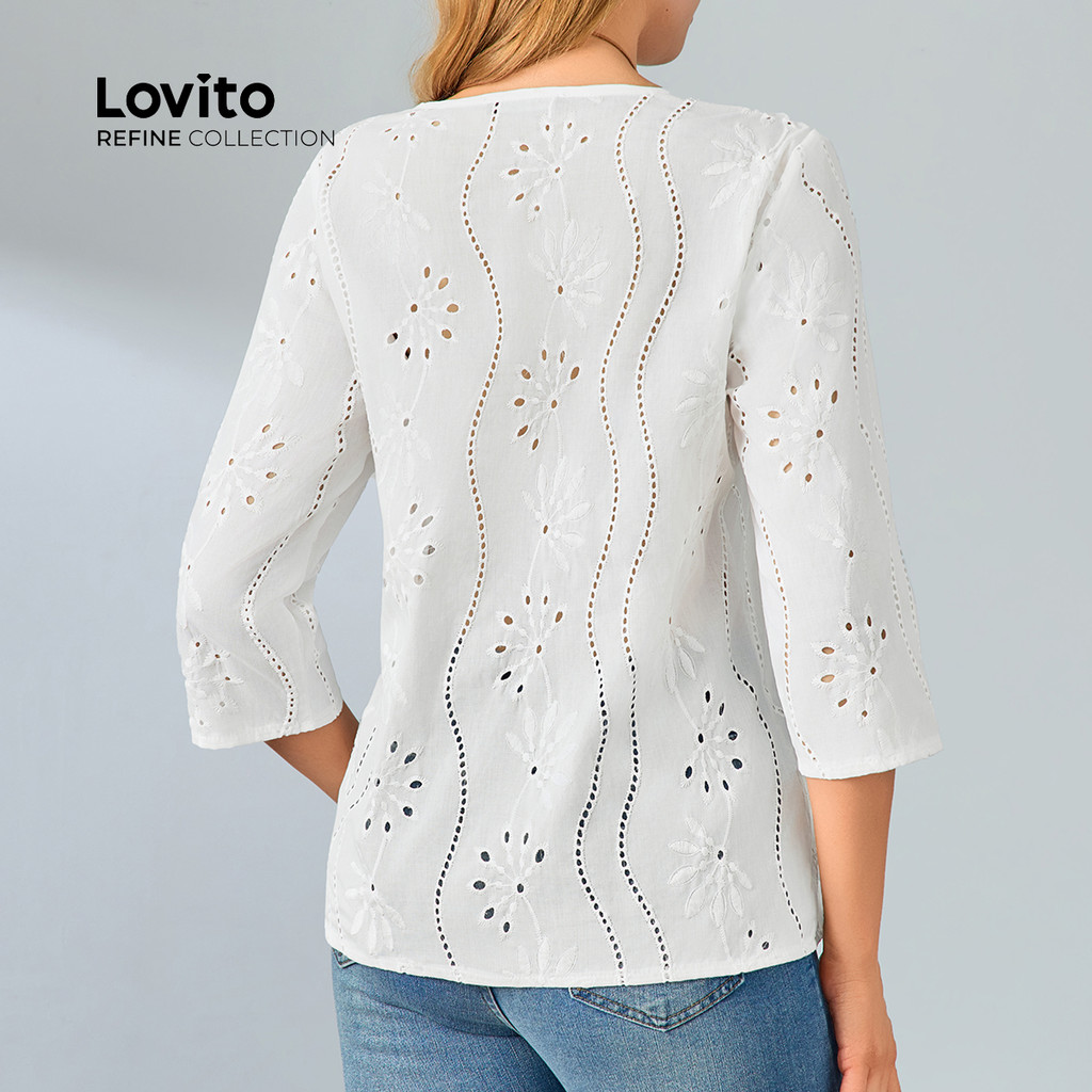 (Lovito Refine) Blusa Casual Lisa Com Bordado De Ilhós E Renda Branca Para Mulheres LR11LD064