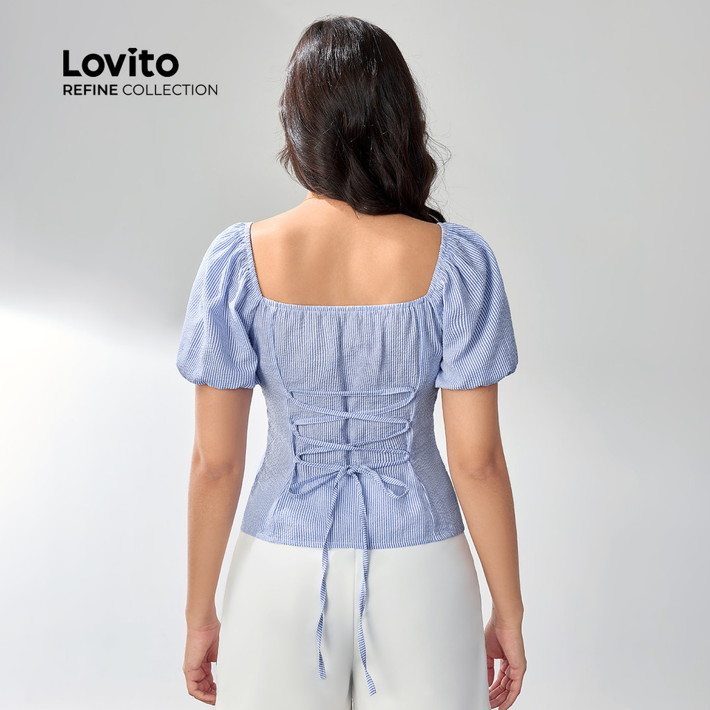(Lovito Refine) Blusa Elegante De Algodão Listrada Com Amarração E Tecido Texturizado Para Mulheres LR4LD114