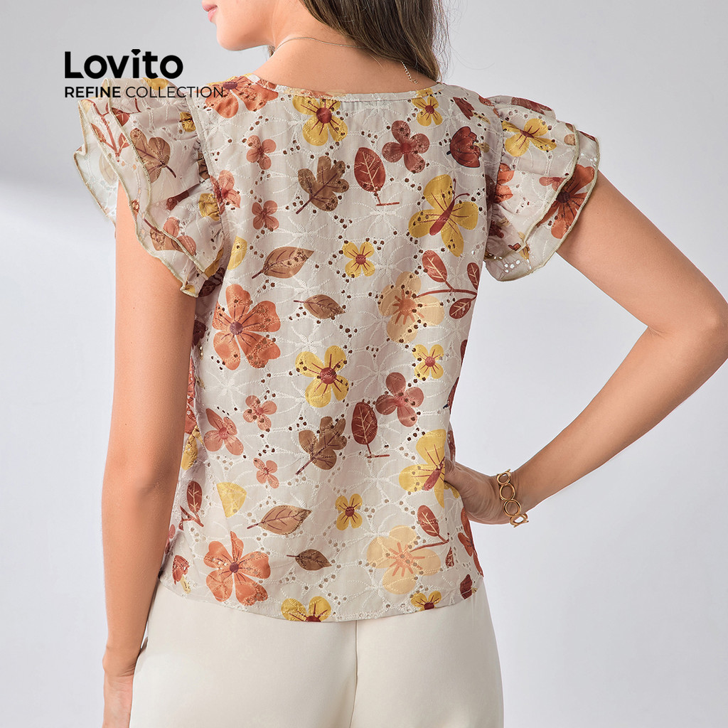 Lovito Refine Blusa Feminina Elegante Colorblock Bordado Ilhós Verão Primavera Textura Macia LR12L018