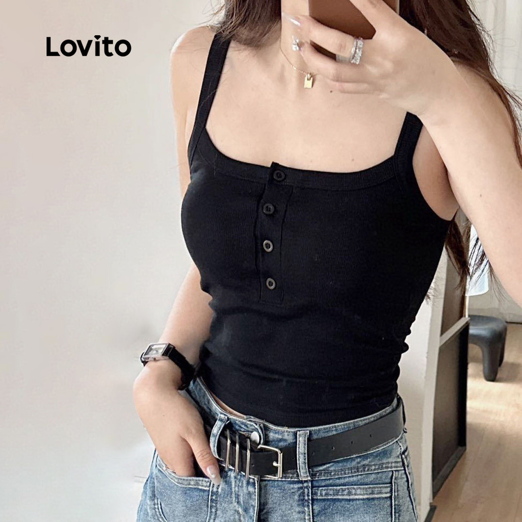 Lovito Refine Camisa Feminina Casual de Botão, Clássica e Versátil para Primavera/verão, Cor Preta, L138ED169