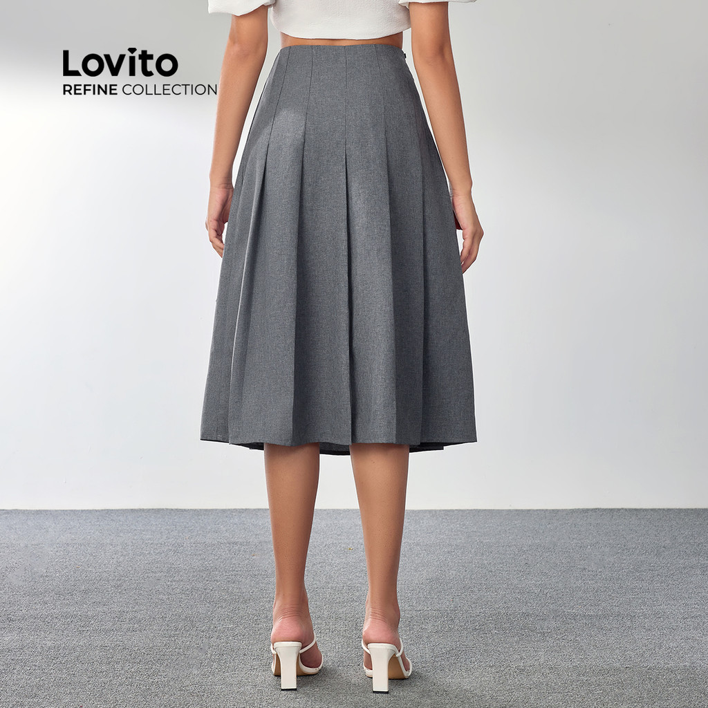 (Lovito Refine) Saias elegantes com apliques de botões plissados lisos para mulheres LR4LD028