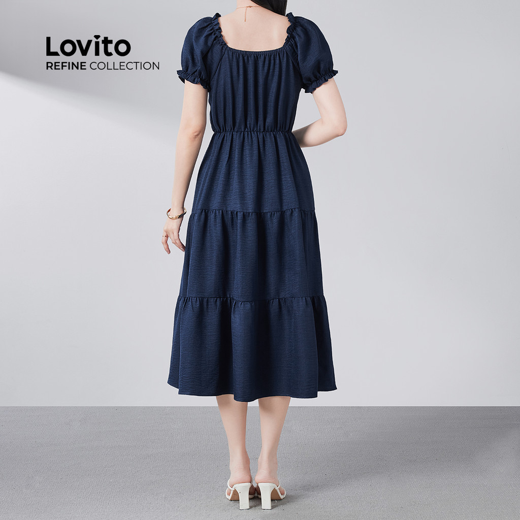 (Lovito Refine) Vestido Boho com Babado Na Bainha Vestido Azul Primavera/verão para Mulheres LR26E009