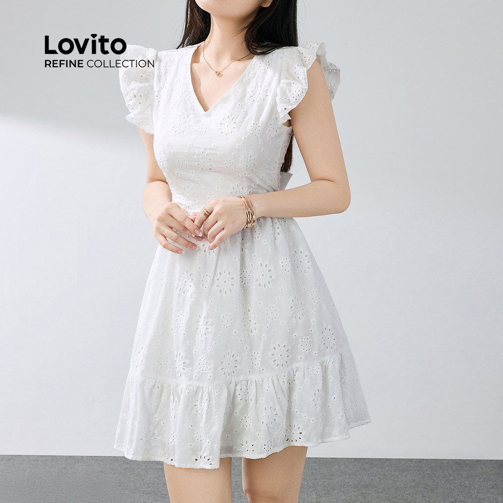 (Lovito Refine) Vestido Casual Em Algodão Bordado Com Ilhós Branco Primavera/verão Para Mulheres LR12ED031