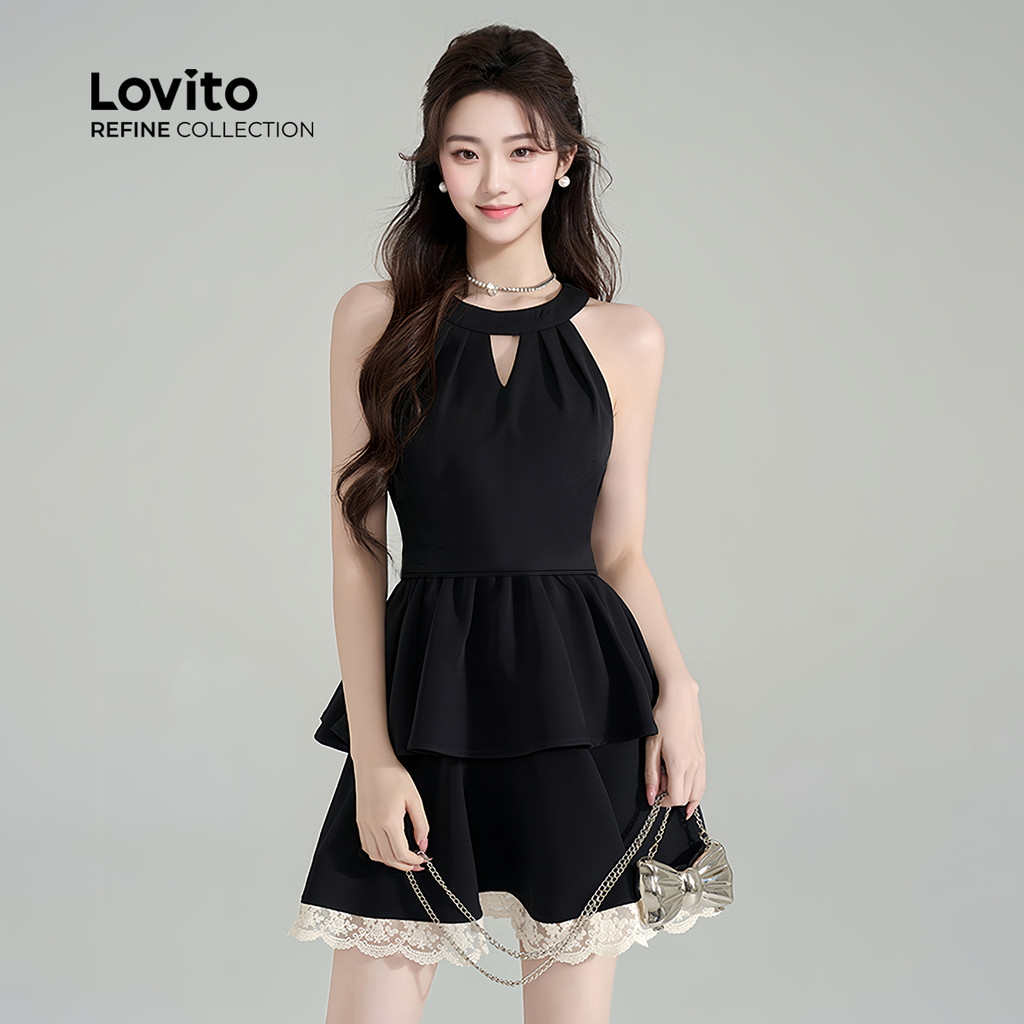(Lovito Refine) Vestido Casual Feminino Liso Renda Drapeado Recorte Verão/primavera LR7AD001
