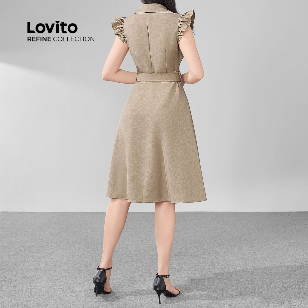 (Lovito Refine) Vestido Elegante Liso Com Babados Cinto Botões Cáqui Vestido De Verão/primavera Para Mulheres LR11ED031