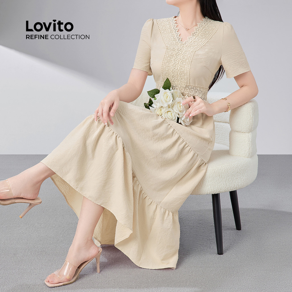 Lovito Refine Vestido Feminino Boho Renda Primavera Verão Caqui LR23E048