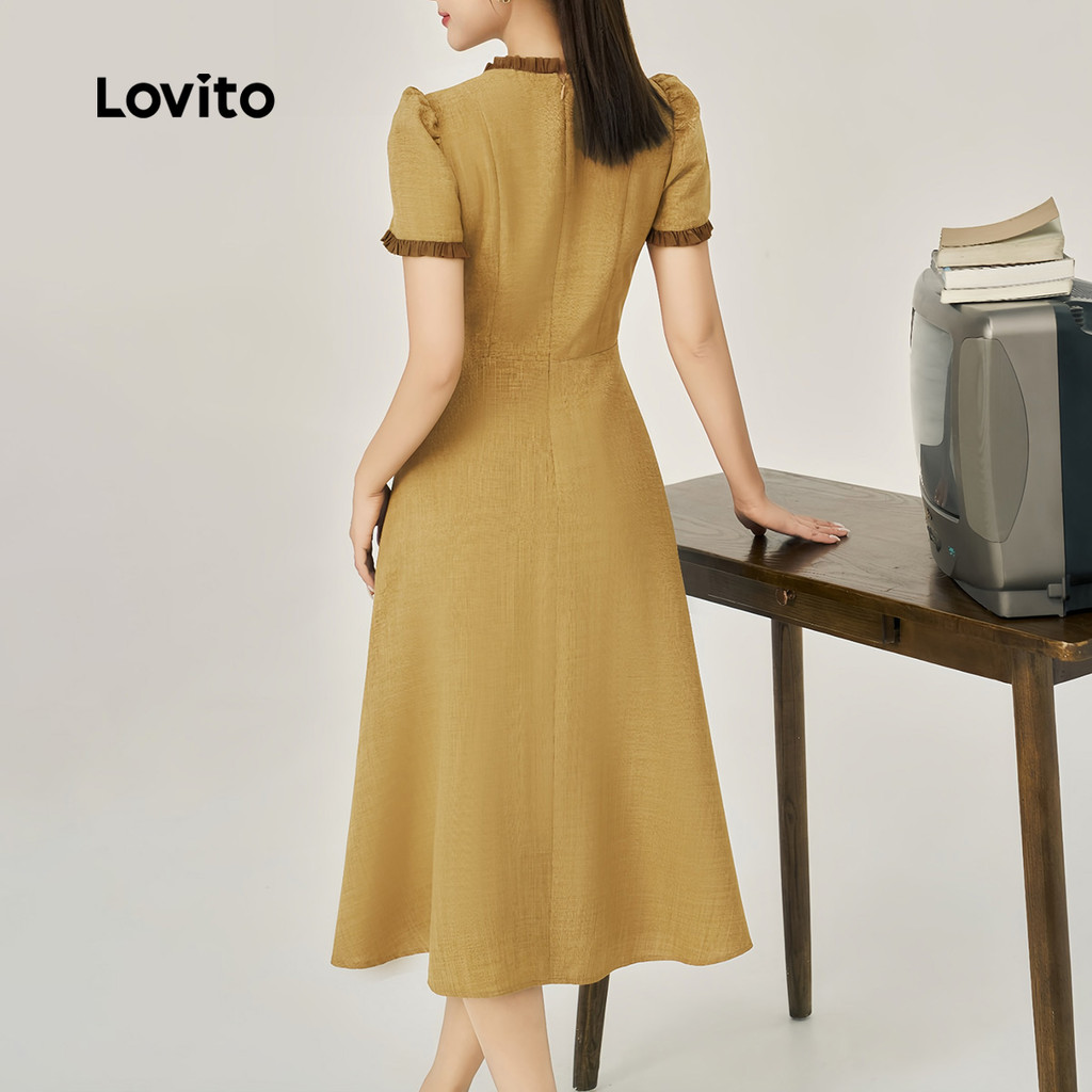 Lovito Refine Vestido Feminino Elegante com Borda de Alface e Laço Colorblock Primavera/verão Khaki. L172ED803
