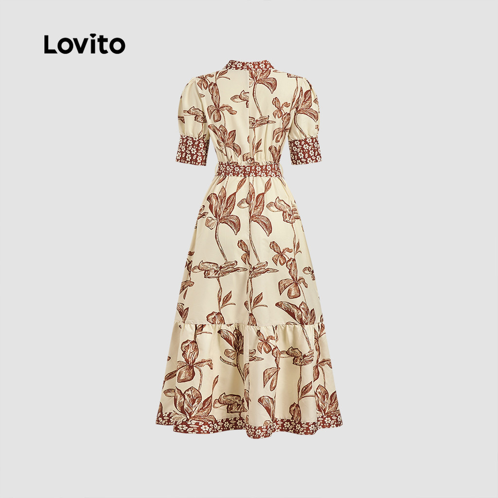 Lovito Refine Vestido Floral Feminino com Cinto para Primavera Verão Marrom LBL25104