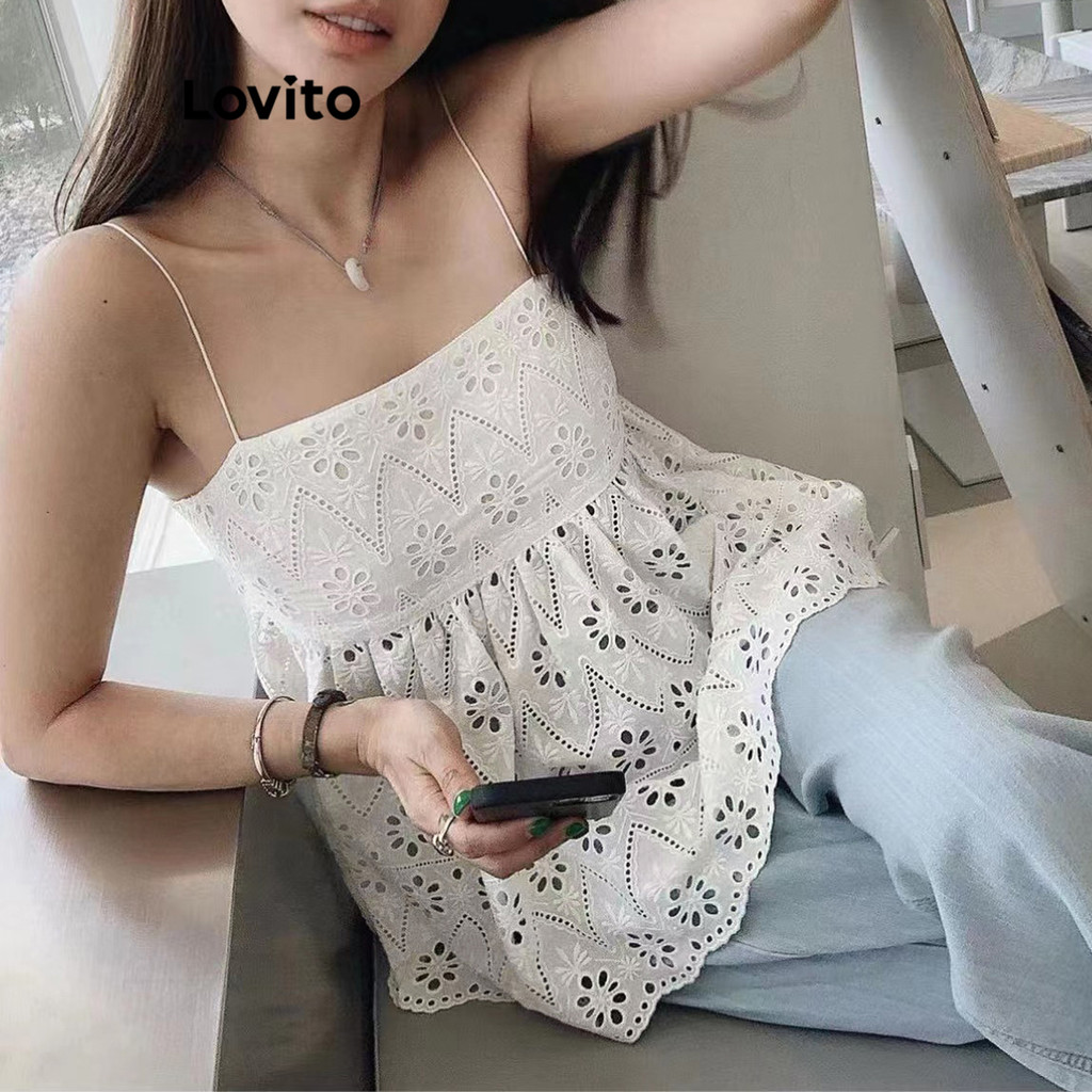 Lovito Regata Boho Bordada com Ilhós e Babado, Bainha, Top de Verão para Mulheres L74ED138