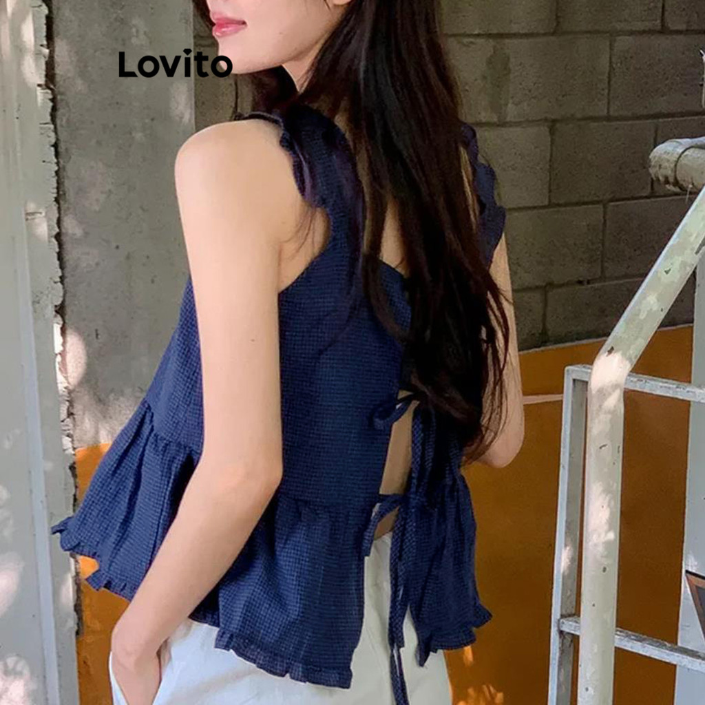 Lovito Regata Casual Guingão Com Babados Na Bainha E Amarração Nas Costas Para Mulheres L96MD168
