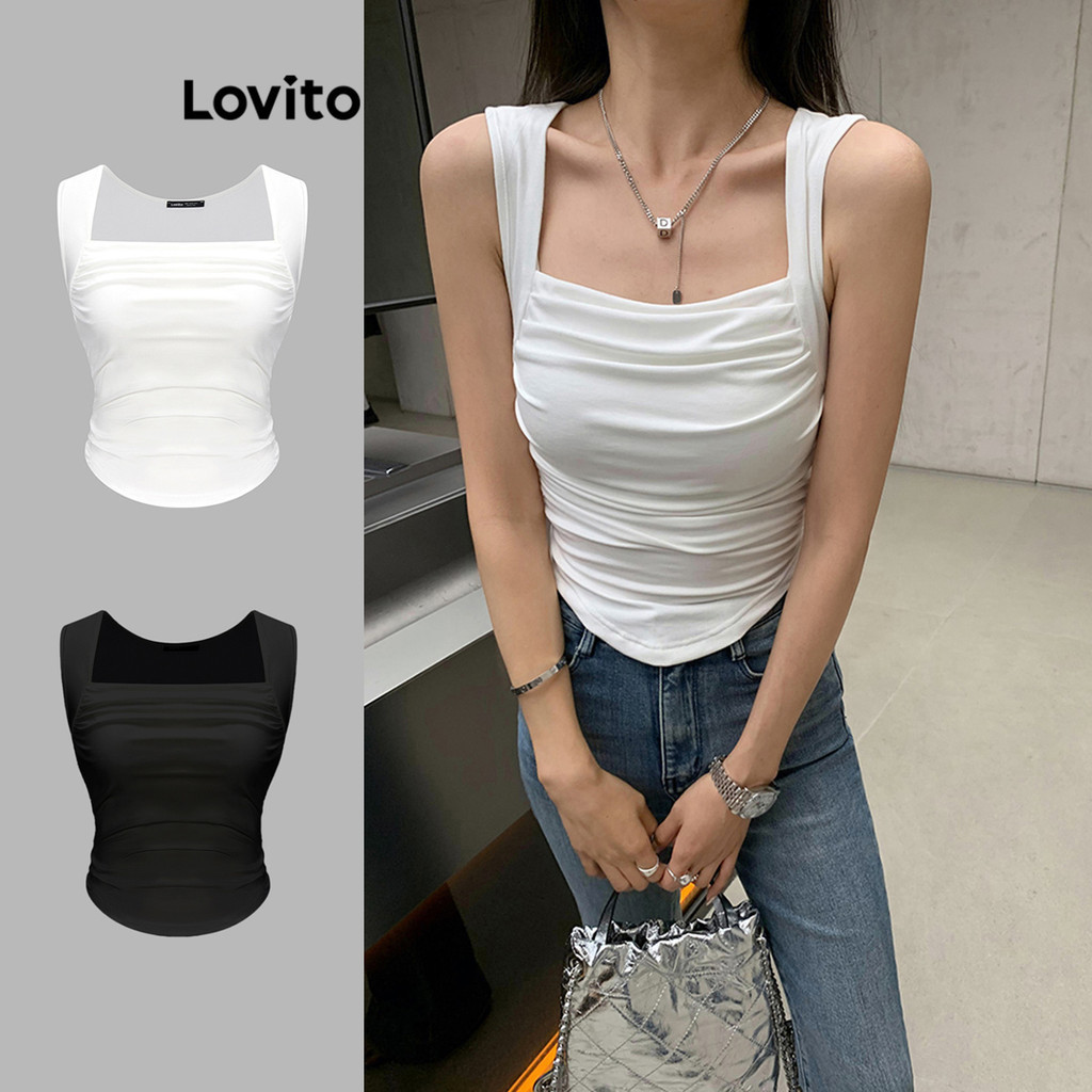 Lovito Regata Casual Lisa Com Bainha Franzida Para Mulheres L62ED045 (Branco/Preto)