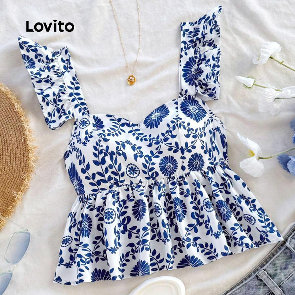 Lovito Regata Feminina Casual Com Estampa Tribal E Babados Primavera/Verão Azul L134ED975