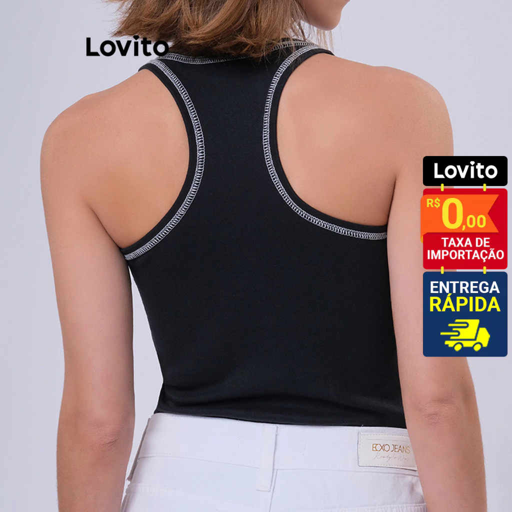 Lovito Regata Preta Casual Lisa com Costura Contrastante Feminina LB47BRL076