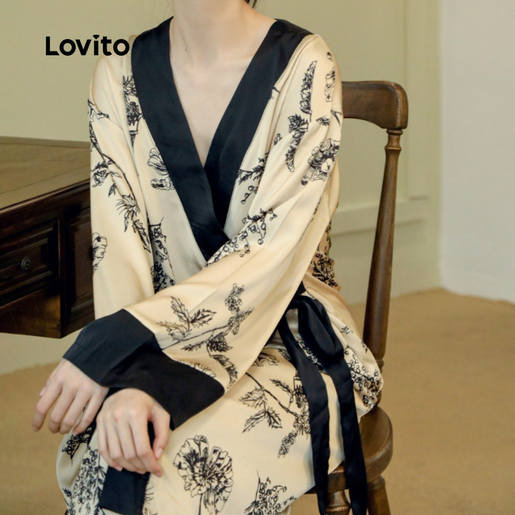 Lovito Robe 2 Peças Seda Estampa Floral Solta Amarração Primavera/Verão LNE130096