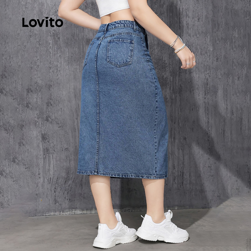 Lovito Saia Jeans Casual com Fenda Assimétrica Bolso Primavera/verão Saia Jeans Azul para mulheres L142ED172
