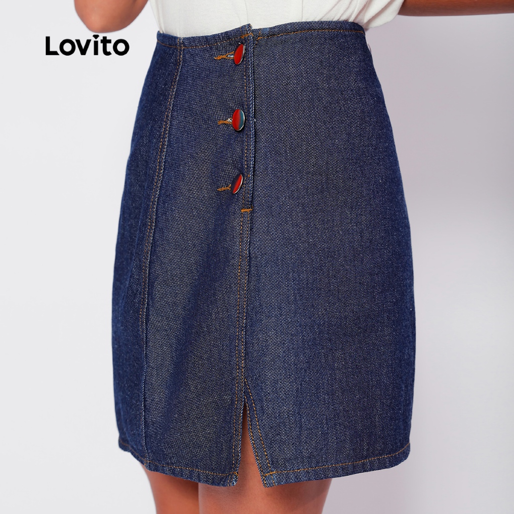 Lovito Saia Jeans Elegante Curta Botões com Mini Fenda e Transpasse DSB726BRL756