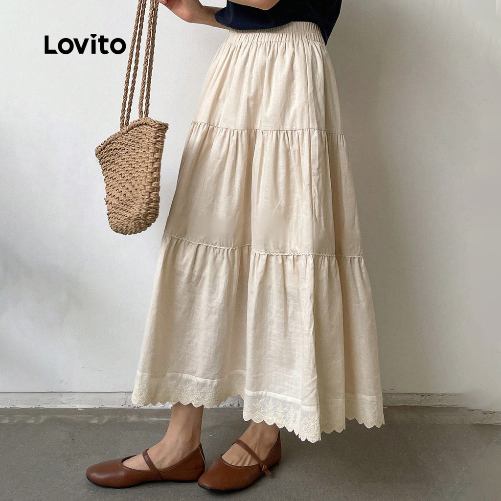 Lovito Saia Longa Casual De Linho Com Bordado Camadas De Renda Cor Damasco Ideal Para Primavera/verão LBL32087
