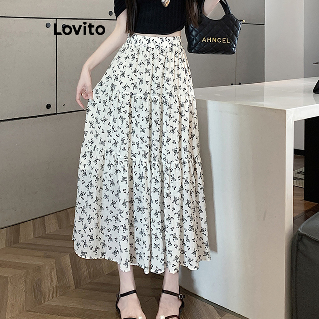 Lovito Saia Longa Feminina Estampada Floral Estilo Básico LNE17088 (Branca)