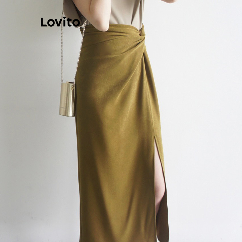 Lovito Saias Casuais Femininas Lisas Drapeadas Nó Verão/primavera L110AD479