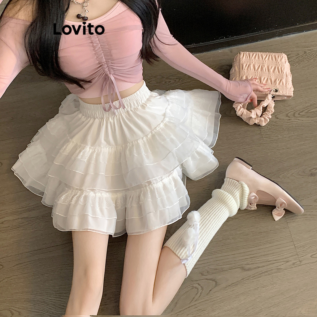 Lovito Saias Fofas Saia De Malha Contrastante De Renda Lisa Em Camadas Para Mulheres L106AD927