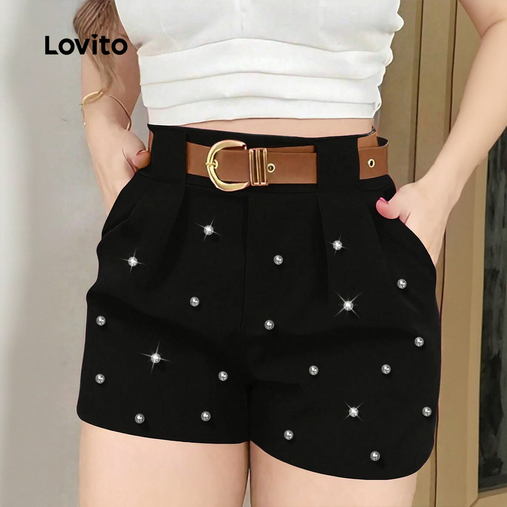 Lovito Shorts Casuais Pérolas Plissados Primavera/verão Shorts Pretos para Mulheres L178LD110