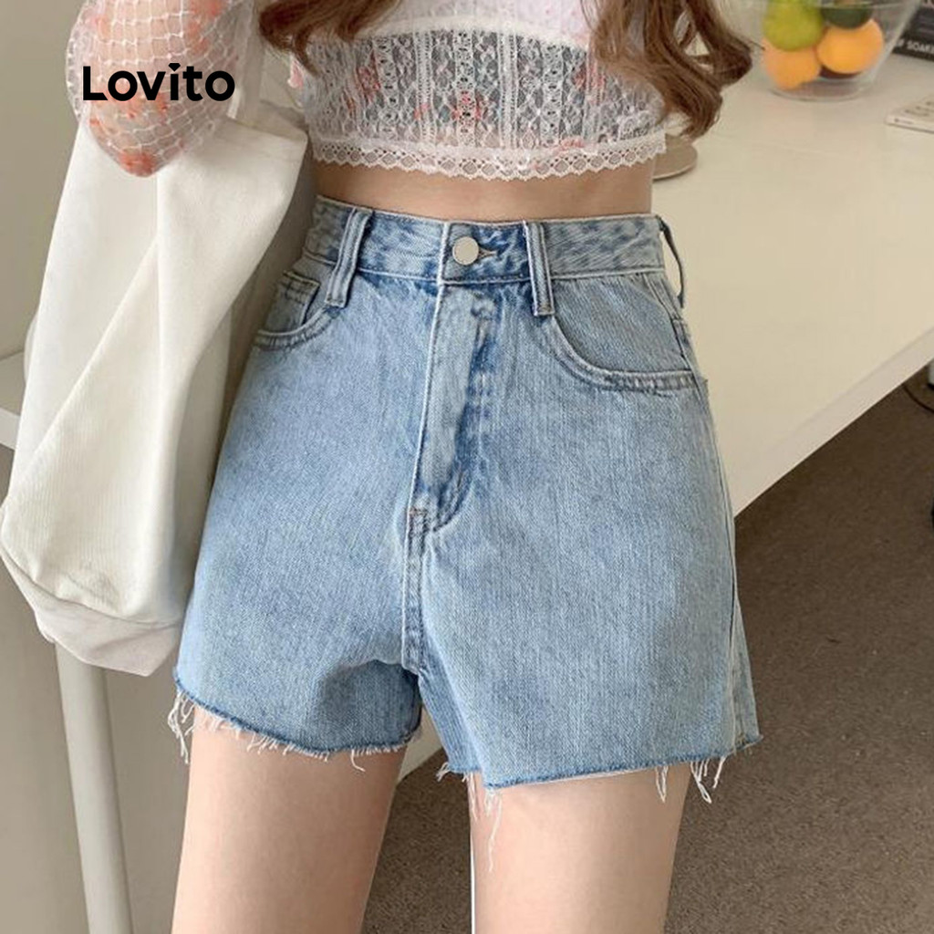 Lovito Shorts de Ganga Casuais Lavados com Zíper para Primavera/verão Azuis para Mulheres LNE130037