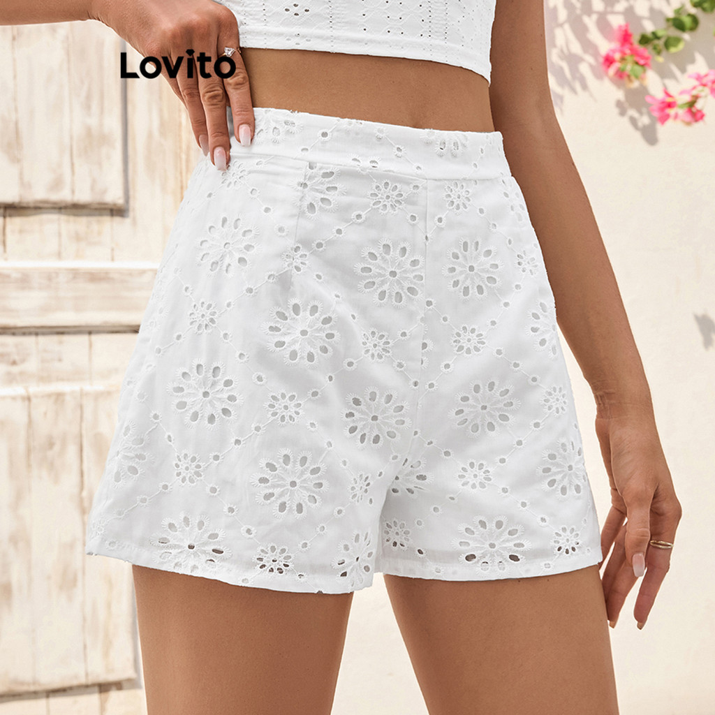 Lovito Shorts elegantes com bordados lisos e ilhós para mulheres LBL18106