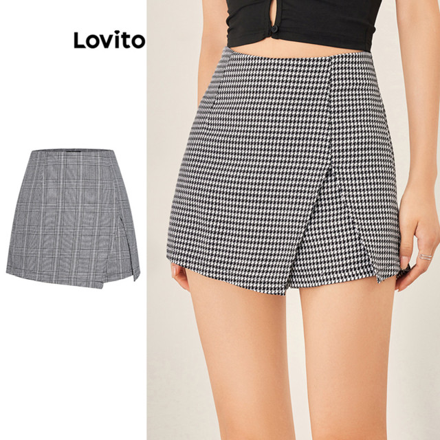 Lovito Shorts Feminino Xadrez Pantacourt de Cintura Alta com Fenda e Zíper Frontal L53AD076 (Pied-de-Poule/Xadrez)