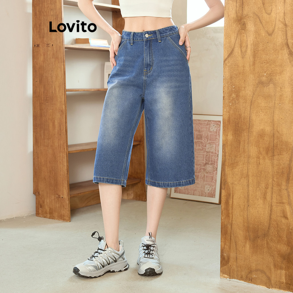 Lovito Shorts Jeans Casuais Com Botão Liso Verão/Primavera Shorts Jeans Para Mulheres L99ED931