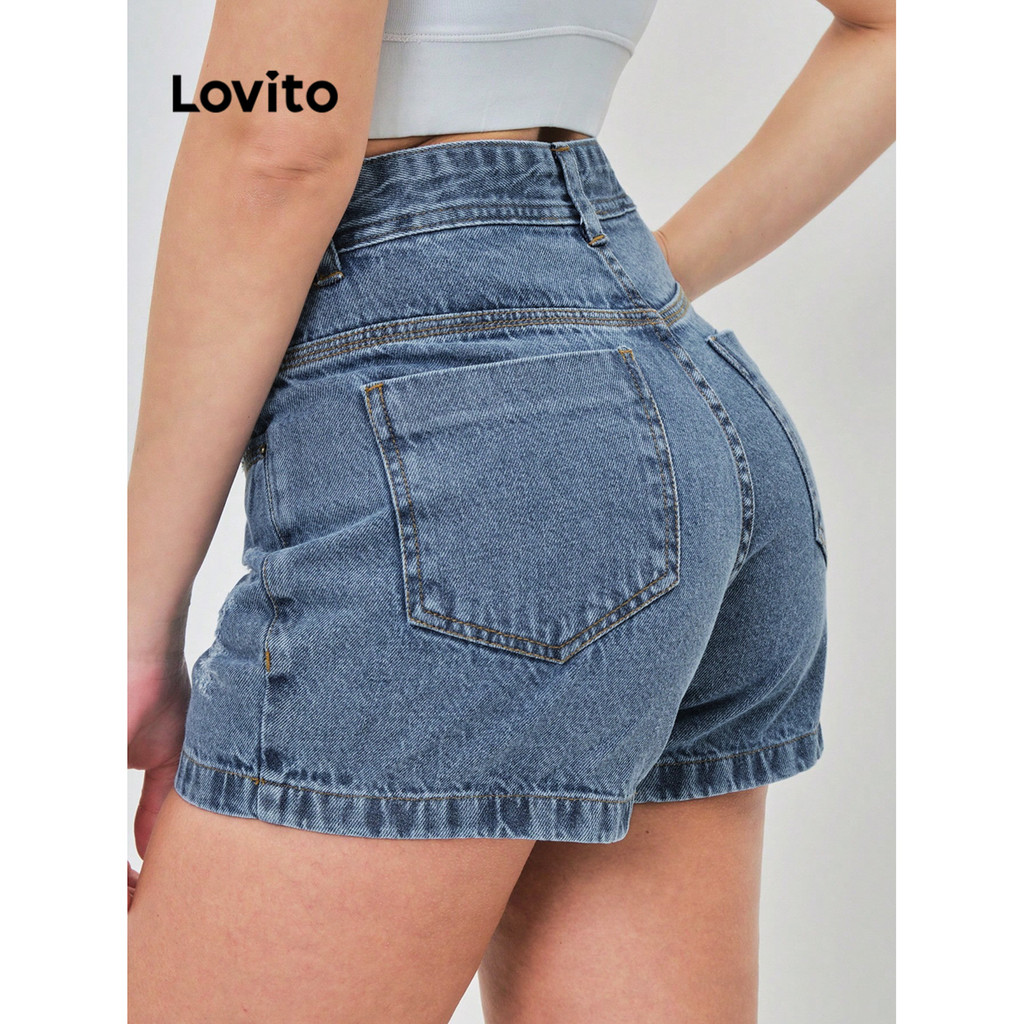 Lovito Shorts Jeans Feminino Casual Lavado Assimétrico com Spikes LBL05230 (Azul)