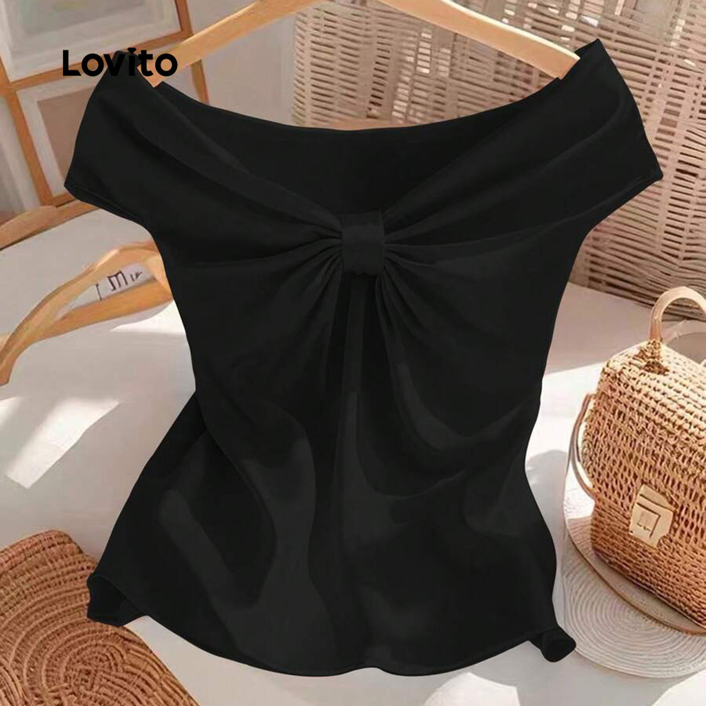 Lovito T shirt Casual com Laço Nas Costas Macio e Confortável para Primavera/verão T shirt preta L137ED649