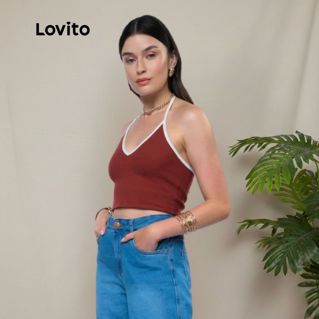 Lovito Top Decote V Basico Marrom Moda Feminina Com Amarração de Malha LB969BRL999
