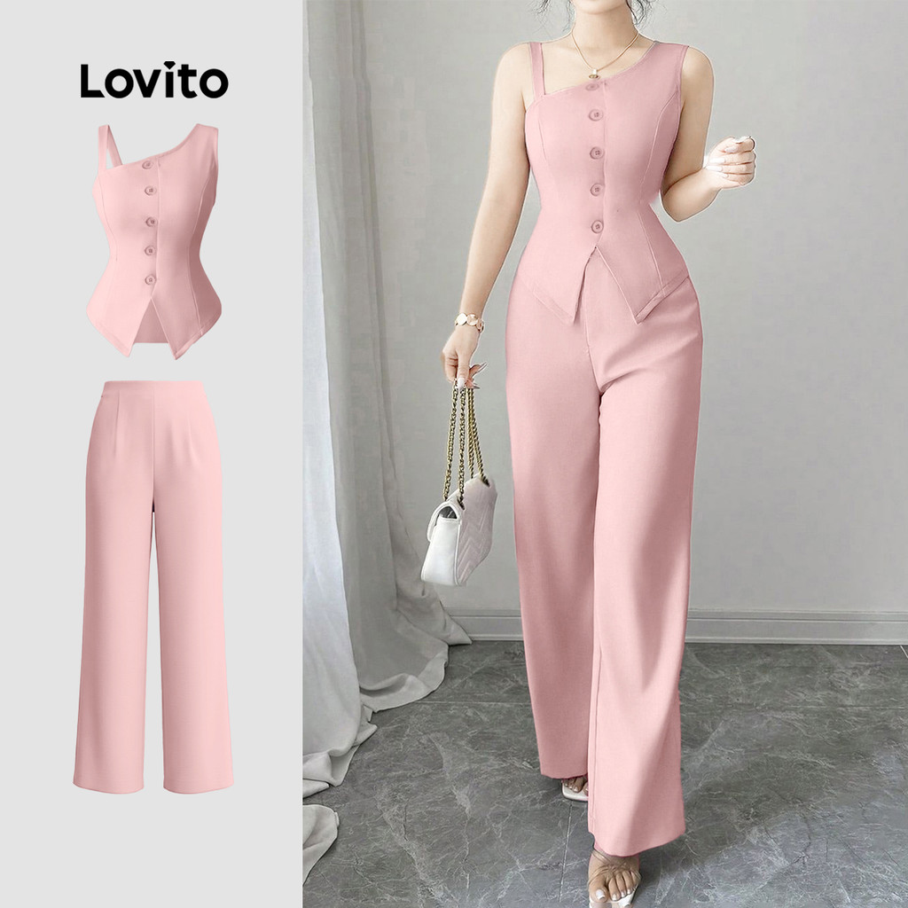 Lovito Tops ou calças casuais com botão assimétrico primavera/verão rosa colete tops ou calças para mulheres LK3ED623
