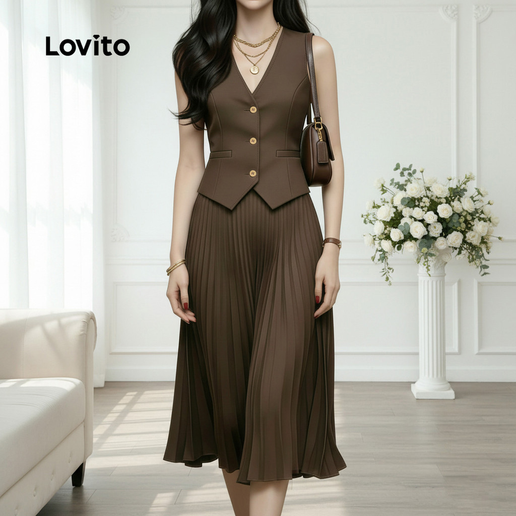 Lovito Tops ou calças elegantes plissadas primavera/verão saia marrom tops ou calças para mulheres LK3ED1503