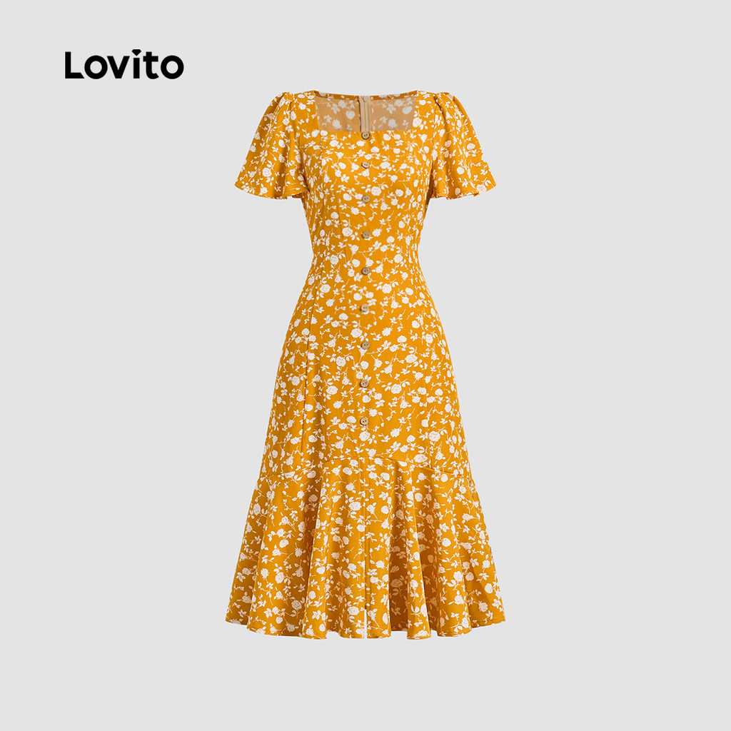 Lovito Vestido Boho Babado Hem Botão Zíper Primavera/Verão Vestido Amarelo Para Mulheres L134ED673
